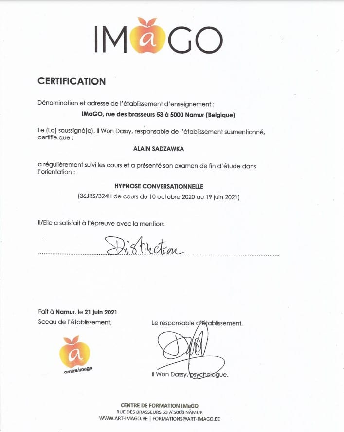 Après avoir participé à de nombreux stages de psychologie, de développement personnel et de remise en question de soi, j'ai été formé à la psychothérapie et au suivi des patients à Namur. Ma formation me permet de rapidement déterminer les blessures de mes patients, et ainsi de leur venir en aide de manière efficace.